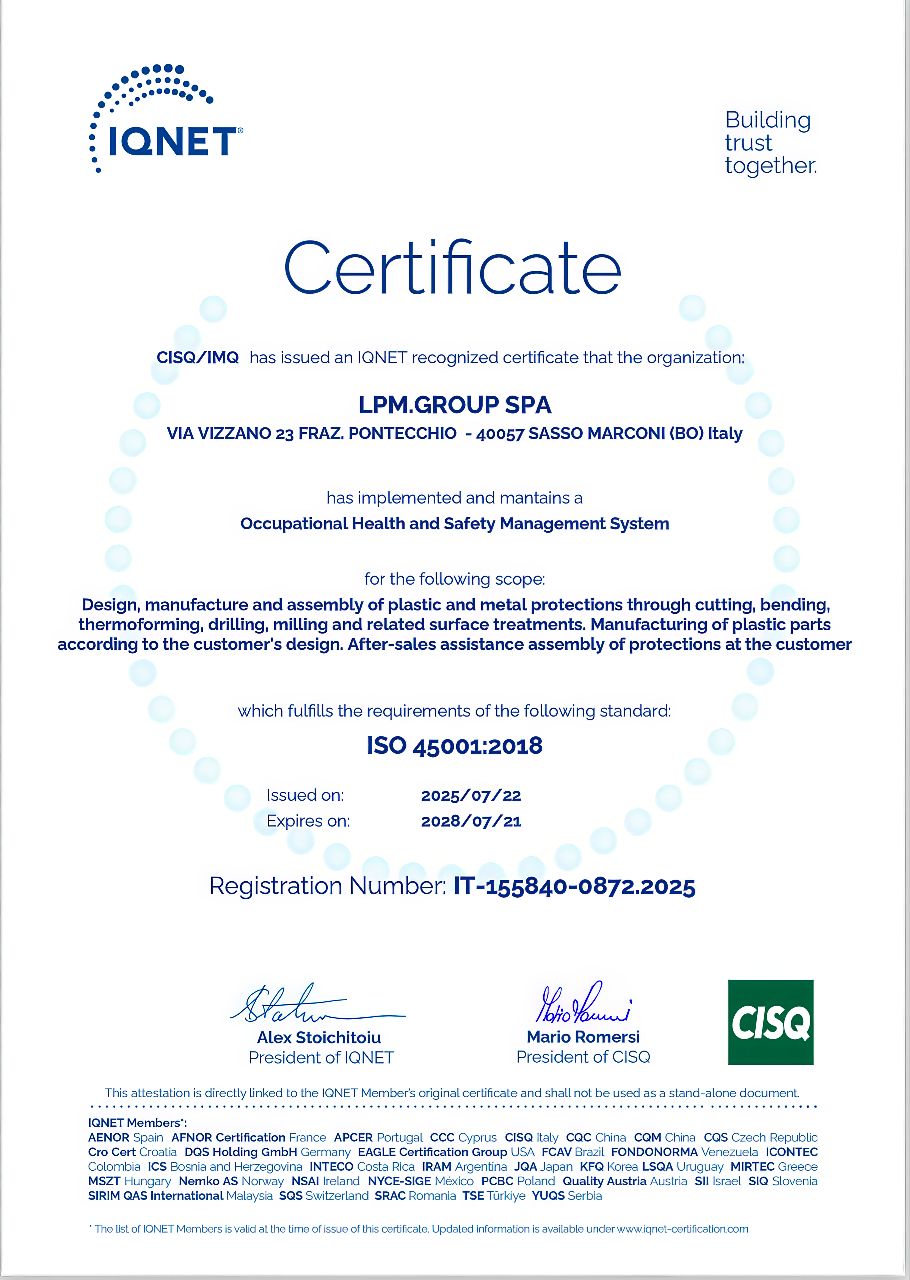 LPM GROUP SPA ha ufficialmente ottenuto la certificazione ISO 45001:2018, rilasciata da IQNET, uno dei più autorevoli organismi di certificazione italiani. Questo importante riconoscimento attesta la piena conformità del nostro sistema di gestione della salute e sicurezza sul lavoro agli standard internazionali più avanzati.