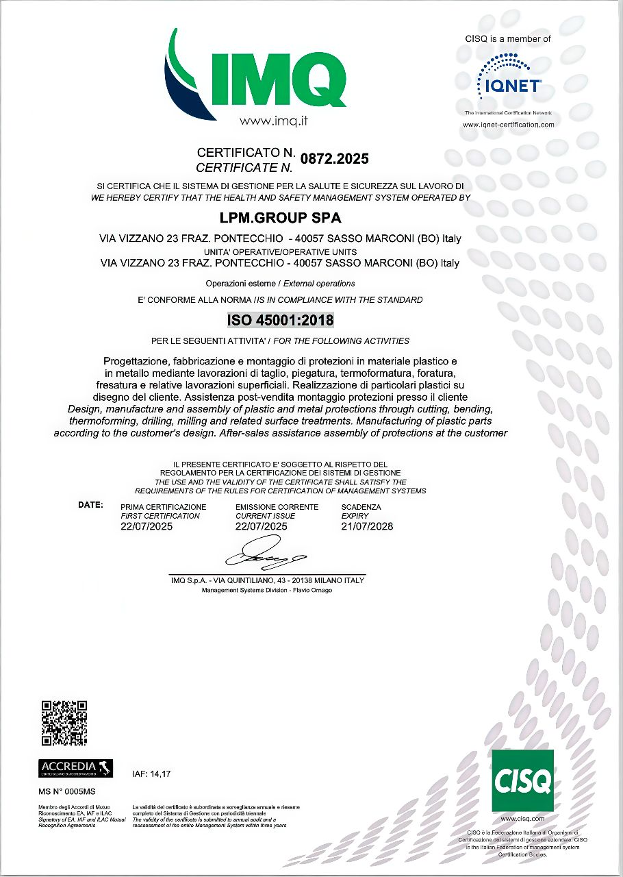 LPM GROUP SPA ha ottenuto la prestigiosa certificazione ISO 45001:2018, rilasciata da IQNET, per il proprio sistema di gestione della salute e sicurezza sul lavoro. Un risultato che testimonia l’impegno concreto e continuo dell’azienda nella tutela delle persone, nell’organizzazione responsabile dei processi e nell’adozione di standard internazionali per garantire ambienti sicuri, controllati e all’altezza delle aspettative di clienti, collaboratori e stakeholder. Un passo avanti che rafforza i valori fondanti dell’azienda.